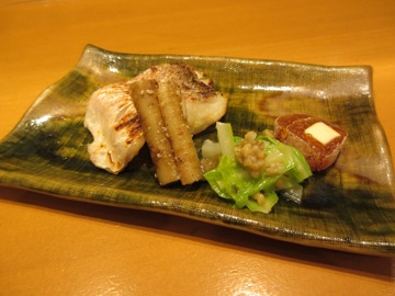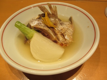 さて、当方は「庖丁一本」でもいつものアレをやらねばならない。12月に佐藤さんに取材依頼を取り付けてから湯浅醬油・丸新本家より幾つかの商品を送ってもらっていた。それを佐藤さんが味見をし、今回の取材用に調理をしてくれたわけだ。「スタンダードな料理づかいでもいいですか?」と佐藤さんが言いつつも湯浅醬油関連商品で具現化してくれたのは、いかにも割烹料理然とした魚を使った三品だった。やはり佐藤さんは和の職人で、魚を用いての表現方法にしたかったようだ。出してくれたのは、①甘鯛の塩麹焼き②鰤の煮付け③鯛かぶらである。①には「塩麹」と「青唐辛子金山寺」を、②には「魯山人」醤油、③には「塩麹」が用いられていた。