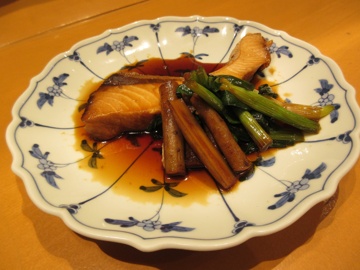 二品目は「鰤の煮付け」である。「鰤の煮付け」は、普段からよく作る料理で、いつもなら大手メーカーの醤油を用いる所を今回は「魯山人」醤油を使用して調味したそう。鰤というと氷見(富山)がブランドだが、最近は値が高く、なかなか入手しにくいようだ。「北海道のは淡泊だし、和歌山のは造りにはいいが、焼物に向かない」らしく、思案していた所に対馬(長崎)のいい鰤が手に入った。そこでこの鰤を使って「魯山人」醤油で煮付けようと考えた。「魯山人」醤油・みりん・酒・ほんの少しの砂糖で煮付ける。初めは水・酒・みりん・砂糖で10~15分鰤を煮て、その後「魯山人」醤油を加えて10~15分煮て行く。まず醤油以外で煮込むのは、中に甘みを染み込ませないと、後から醤油が入って行きにくくなるから。「初めから全て合わせて煮ると味が染み込みにくい」と指摘していた。佐藤さんは、この取材まで「魯山人」醤油の存在は知らず、送られて来て初めて味見をして驚いたという。「見ために色が濃いので比例して味も濃いと錯覚していたのですが、舐めてみてびっくり!他の醤油とはまろやかさが違っていたんです。味もすっきりして舌から消えるから切れがいいんでしょうね。昔、私の家でも醤油を送っていたのですが、造り立てを舐めた時の味に似ていました。これなら造り用の醤油を自店で作らなくても使えそうと思いましたね」。「魯山人」醤油で煮た鰤は、流石に黒く濃いが、食べるとあっさりして、また箸を伸ばしたくなる。醤油が替われば、これほどまでに煮付けが替わると実感した次第である。勿論、佐藤さんの技術があってこその話ではあるが…。鰤の付け合わせは、一緒に煮たゴボウと九条葱。ゴボウは共に煮る事で臭みが取れ、味が出て旨くなる。九条葱は最後に入れて煮る。2~3分も煮ればしんなりして出来上がる。