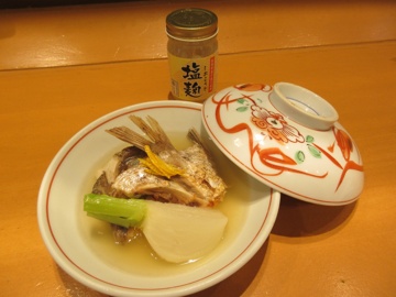 三品目は「鯛かぶら」だ。鯛のアラを素焼きにし、みりんを打って「塩麹」を入れて煮込む。蕪は後から湯がいたのを入れて10~15分程煮込めば出来上がる。「鯛のアラを『塩麹』・みりん・昆布・鰹で作っただしで煮ます。普段は塩・淡口醤油・みりんでやるのですが、今回は醤油や塩を用いずに『塩麹』で調味したんです。『塩麹』は、まろやかでコクがあるからそれだけで充分。淡口醬油や塩の役目をそれ単体で果たしてくれるんです」と話していた。「庖丁一本」では、蕪のある時季は、よく「鯛かぶら」をコース内で提供するそうだが、「いつもやるよりは、あっさりしている」との感想を持っていた。「甘みは少し薄くとも充分な味わいになっている」と言っていた。