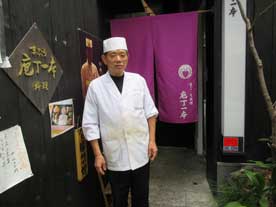 それから一カ月ぐらい経った1月中旬に「庖丁一本」を覗くと、佐藤さんが湯浅醬油・丸新本家の商品を使った取材用料理を作ってくれた。そこで佐藤さんに経歴についていろいろと話を聞いた次第である。佐藤光義さんは、静岡県富士市の出身。本人曰く「富士山の山の中で生まれ育った」らしく、百軒くらいの小さな村の出身だそう。高校を卒業すると料理人を志し、「あべの辻調師理専門学校」に入って調理を学んだ。卒業後、当時北新地にあった割烹「菊屋」に勤めて日本料理の職人の「いろは」を歩んでいる。佐藤さんは「菊屋」の井上師の下で追い回してからスタートしたのだが、師匠の井上さんはそれはそれは厳しい人で、料理人としての名声も轟いていた。かつて料理人紹介所としてあった「京繁」で、こんな唄が囁かれていた。「鬼の門三、蛇の菊屋、二度と来るな水明館」と_。これは親父(師匠)が厳しい三大名店の例え唄で、指導や仕事が厳しい事で若い料理人の中では密かに唄われていたようだ。「若い料理人の中でも『菊屋』にいたというと鼻高々。井上さんは本当に仕事に厳しい方で、仕事場では若い子はまず直立不動で話を聞かねばなりません。まさに技は盗めの時代で、高下駄を履いて仕事をしていました。その時は私を含め5人の若手が入ったのですが、一週間経つと私一人になってしまいました。修業が厳しいとみんな逃げ出したんですよ」と佐藤さんは笑いながら修業時代を振り返ってくれた。佐藤さんは、井上師の背中を見ながら日本料理の仕事を覚え、約4年程「菊屋」で修業を続けた。その後、住吉の日本料理店へ移っている。色んな店で修業を重ね、北新地にあった「井奈川」では煮方まで出世していた。ところが運悪く身体を壊してしまって入院。医師からも「退院しても仕事をすると余計に悪化させる」と脅(おど)されたそうだ。もう過酷な板場には戻れないと踏んだ佐藤さんは、24歳という若さで独立を果たす。他人に使われるのではなくて自分のペースなら仕事ができるだろうと踏んでの独立であったわけだ。鶴橋で構えた店は、割烹というより飯屋的な所。「なけなしのお金で作ったのでベエヤ張りのボロボロのような店で、家庭用のガスコンロで調理していたんです」と話してくれた。そんな8坪余りの店で二年半やっていたが、ある時、近所にあった某社の社長が「こんな所でやっていたのでは男が廃る」とばかりに物件を探してくれ、支援までしてくれて北浜・高麗橋に店を構えるように。それが昭和59年の年で、店名を改めて「庖丁一本」と名乗った。それからはとんとん拍子に進み、三年目に天満橋に支店を出し、バブル期の好景気にも後押しされ、本町に三店目も出店する程の勢いを見せた。ところがバブル崩壊によって三店とも閉める羽目に。本店も伏見町へ移したようである。