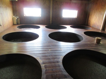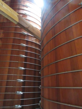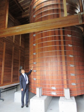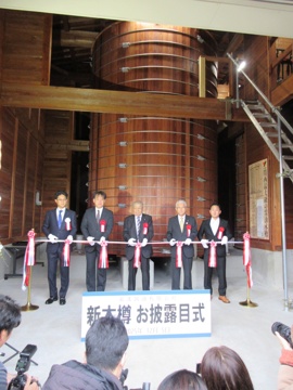 今回新たにお目見得したのは、九𫞂蔵の増設敷地に設置された二基の大きな木樽だ。直径3.4m×高さ5,5mのビッグサイズで、国産杉を用いて作られた醤油木樽としては国内最大級らしい。その高さはキリンの大きさに匹敵するという。新古敏朗さんは、「国産杉で作られた醤油木樽としては我が国で二番目の大きさになるようです。この大きな木樽で醤油を醸造・熟成する事で次の百年へ向けての第一歩が踏み出せた気分です」と清々しく展望を語っていた。